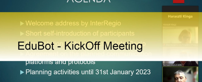 EduBot - KickOff Meeting Az EduBot projekt nyitókonferenciájára 2022. december 15-én került sor az online térben, amikor a partnerek – Magyarországról az Interregió Fórum Egyesület, Romániából Hargita Megye Tanácsa és a RegioNet Alapítvány, Lengyelországból Instytut ADN és Szlovákiából a Tandem n.o. képviselői személyesen is bemutatkoztak egymásnak. A leadpartner