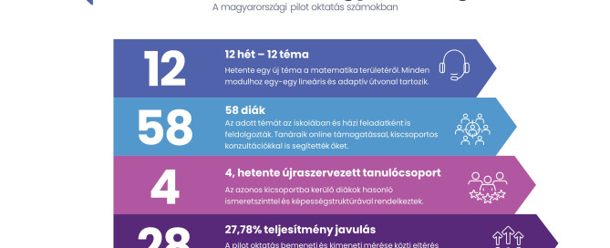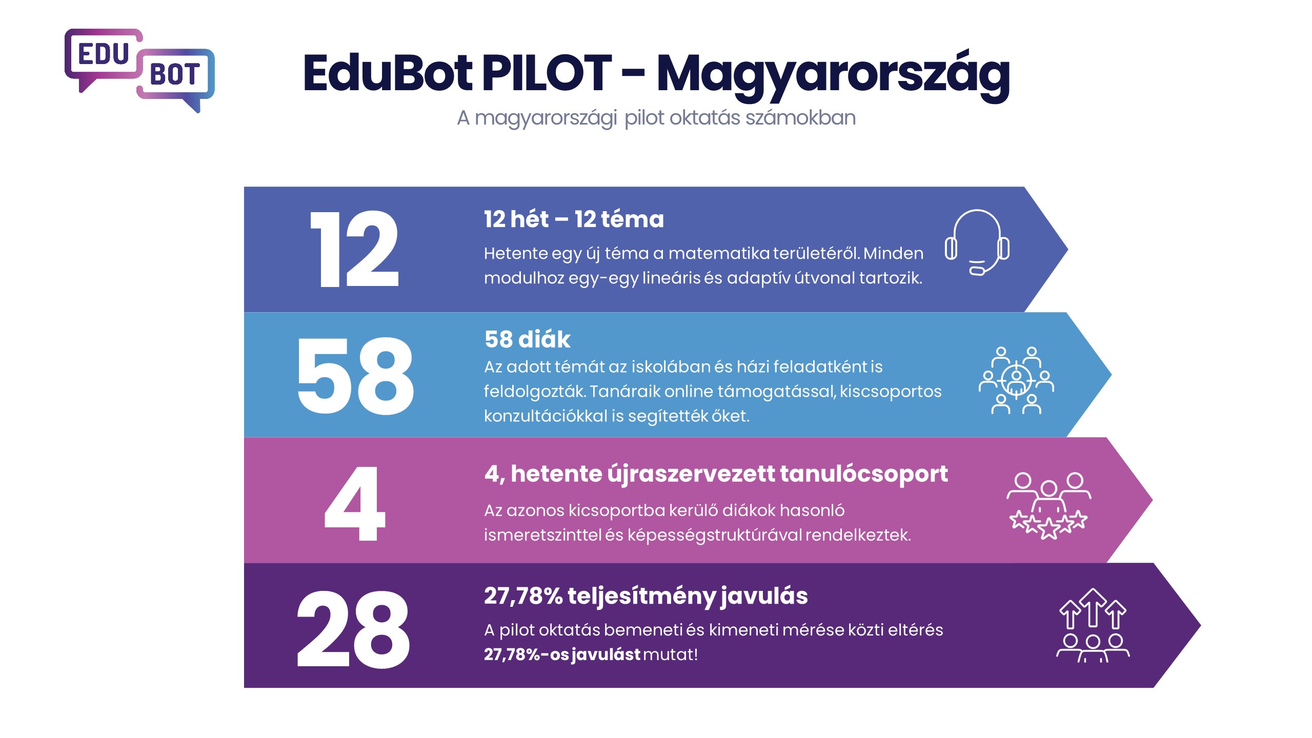 Tizenkét hét, 58 diák négy csoportra osztva, és négy pedagógus – számokban kifejezve az EduBot projekt magyarországi pilotoktatása. A fejlesztett digitális tartalom az egyéni matematika tanulást támogatja e-learning rendszerben. A pilotoktatás során bemeneti és kimeneti tesztelést is végeztek, vagyis mérték a diákok kompetenciáit a pilotoktatás előtt és után.