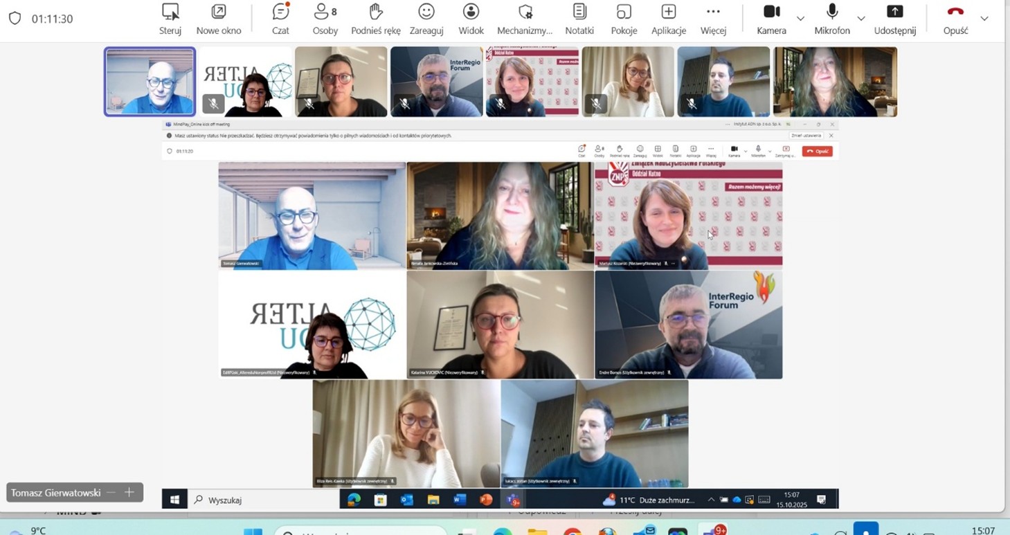 Október 15-én online formában került sor a MindPlay projekt – Mental Health & Safety of Young Pupils through Play – hivatalos nyitóértekezletére. A találkozó összehozta az összes partner képviselőit Lengyelországból, Magyarországról, Németországból, Belgiumból és Romániából annak érdekében, hogy bemutassák csapataikat, közösen meghatározzák a projekt célkitűzéseit, valamint cselekvési tervet állítsanak