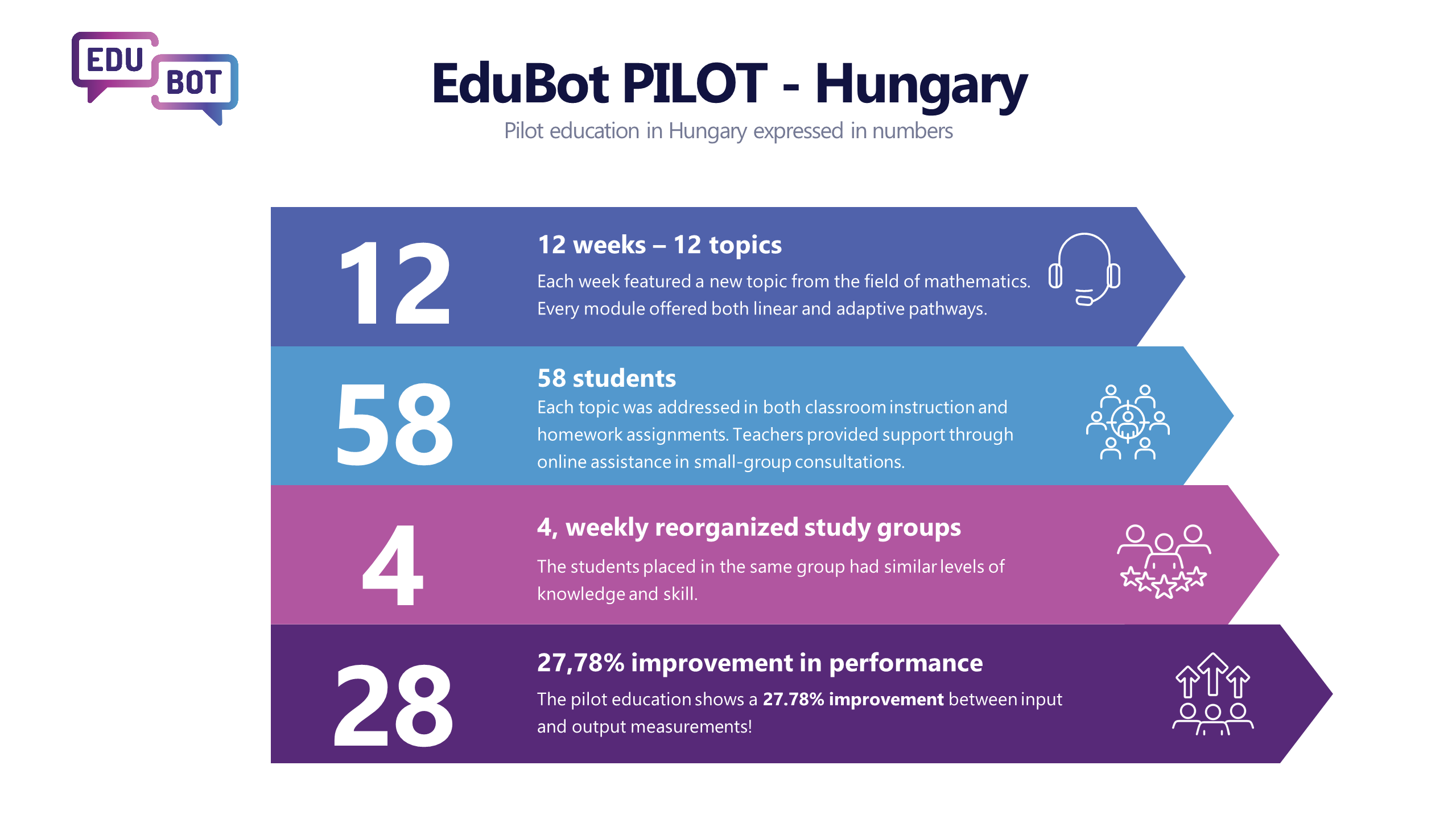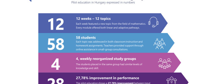 Twelve weeks, 58 students divided into four groups, and four educators - in numbers, the pilot education of the EduBot project in Hungary. The developed digital content supports individual mathematics learning in an e-learning system. During the pilot education, both input and output testing were conducted, measuring students'